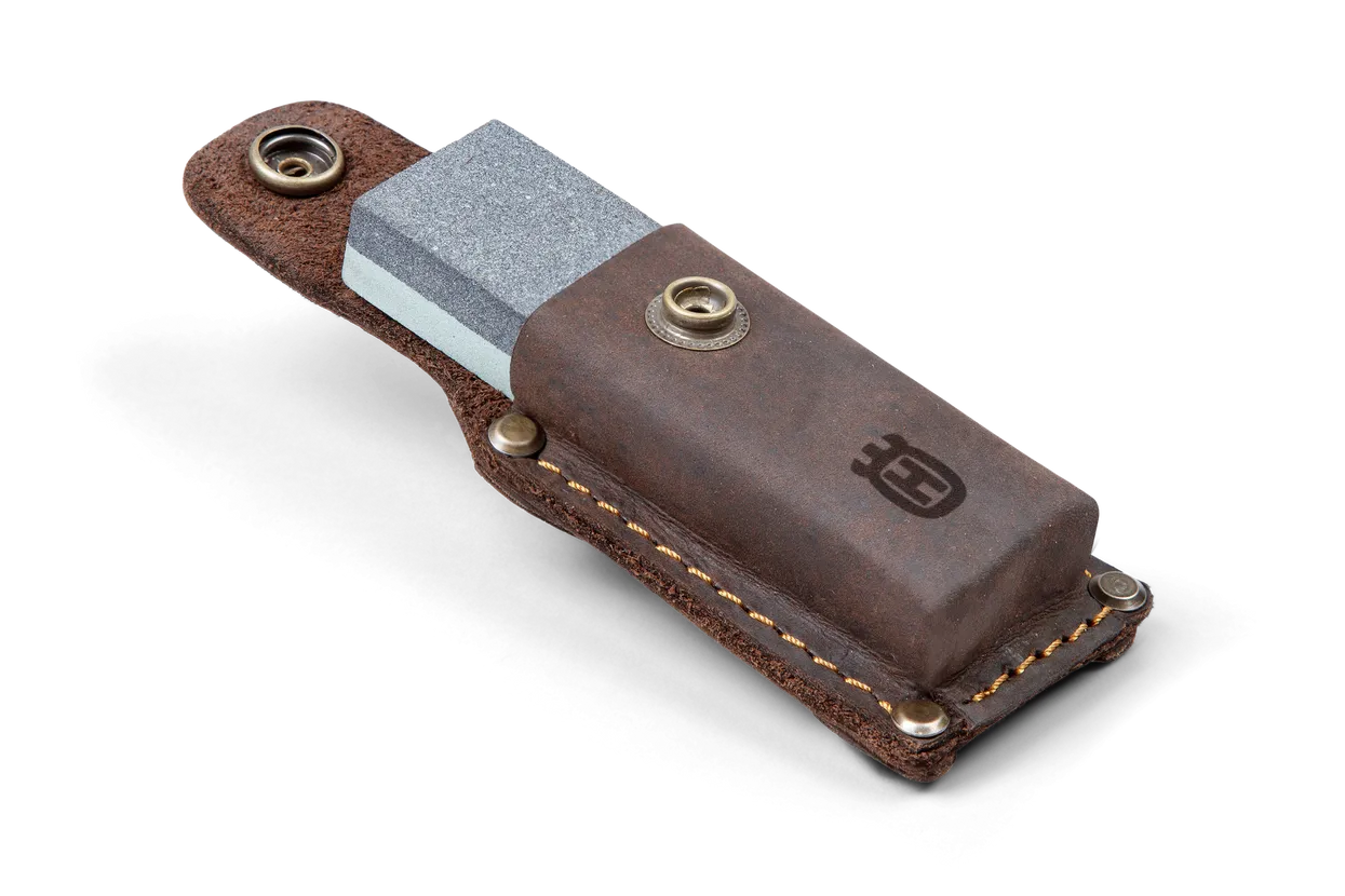 Kleiner Siliziumkarbid-Schleifstein zum Schärfen von Äxten. Doppelkörner (grob und fein) für schnelles oder feines Schärfen. Kann sowohl trocken als auch mit Öl oder Wasser verwendet werden. Kommt mit einem Lederetui.