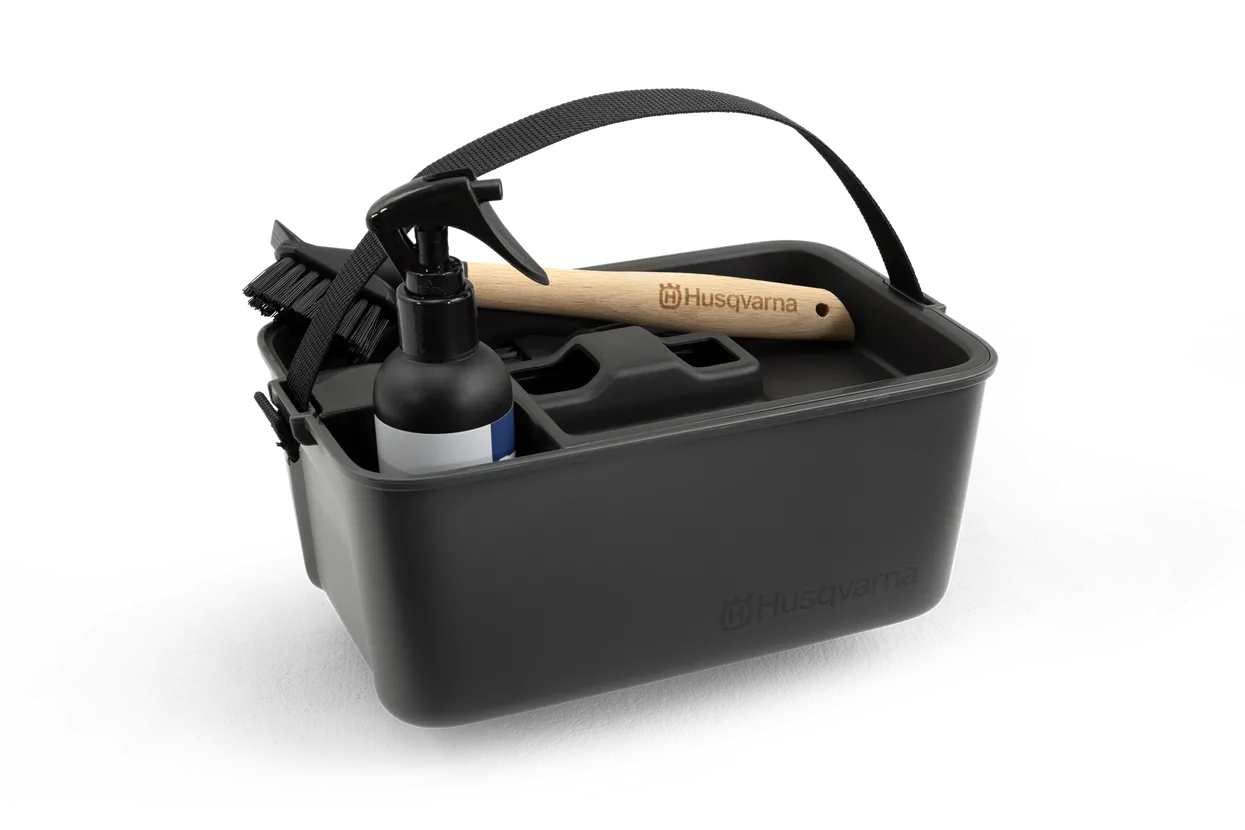 Ein Reinigungs- und Wartungs-Kit, mit dem Sie Ihren Husqvarna Automower® ganz einfach in einwandfreiem Zustand halten. Dieses Set enthält alles Nötige, um Gras und Schmutz zu entfernen und den Mähroboter während der Mähsaison zu reinigen. Zum Set gehören zwei Bürsten: eine kleine für schmale und schwer zugängliche Oberflächen und eine große, die zusammen mit einem Wasserschlauch verwendet werden kann, ein Schleifpad zum Reinigen der Anschlüsse an Mäher und Ladestation, ein Tuch und das Husqvarna Active Clean-Spray. Das Spray lässt sich problemlos auftragen, ist phosphatfrei und biologisch abbaubar und beseitig wirksam jeden Schmutz. In den zusätzlichen Fächern der Box lassen sich wichtige Gegenstände wie Werkzeuge und Klingen bequem aufbewahren und organisieren.