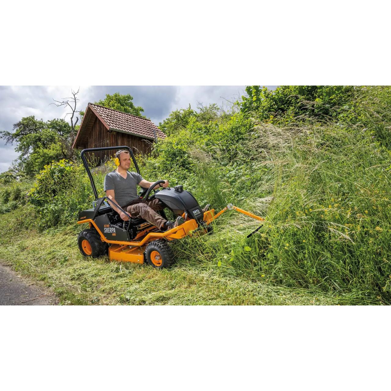 Komfortables Arbeiten ermöglicht die ergonomische Sitzposition. Der in der Position längenverstellbare Schalensitz gestattet es Personen mit einer Körpergröße bis zu 1,90 eine bequeme Sitzposition einzunehmen. Darüber hinaus lässt sich individuell die Federhärte des Sitzfederpakets stufenlos auf jeden Besitzer einstellen. Das sitzen „in“ der Maschine in Kombination mit den seitlichen Astabweisern bietet dem Bediener Schutz und Sicherheit. Wesentliches Merkmal der Konstruktion des AS 940 Sherpa 4WD ist der tiefe Schwerpunkt der Maschine für hohe Kippsicherheit. Die Stabilität und Robustheit der Maschine kommt von einem robusten, umlaufenden Stahlrohrrahmen. Dieser verleiht dem Aufsitzmäher hohe Stabilität und Verwindungssteifheit auch unter harten Arbeitsbedingungen. Für einen komfortablen Transport sind Zurrpunkte im Rahmen integriert. Der klappbare Bügel schützt den Benutzer zusätzlich. Mit seiner getrennten Zu- und Abluftführung ist der AS 940 Sherpa 4WD für den Dauereinsatz gemacht. Hierzu ist die Kühlluftführung von Motor und Hydrostat voneinander getrennt. Der Motor saugt seine Kühlluft von oben an und gibt die warme Abluft zur Seite wieder ab. Der Hydrostat saugt seine Kühlluft von hinten an und gibt die warme Abluft nach unten ab. Dieses System schützt den Aufsitzmäher vor Überhitzung selbst bei hohen Umgebungstemperaturen und maximaler Beanspruchung, was zu einer langen Lebensdauer der Komponenten beiträgt.
